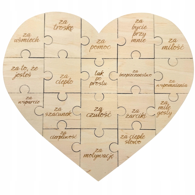 - Na puzzlach nadrukowane są powody miłości (np. „za to, że jesteś przy mnie”)