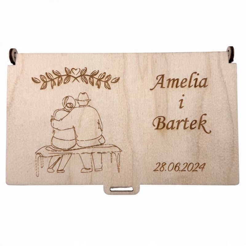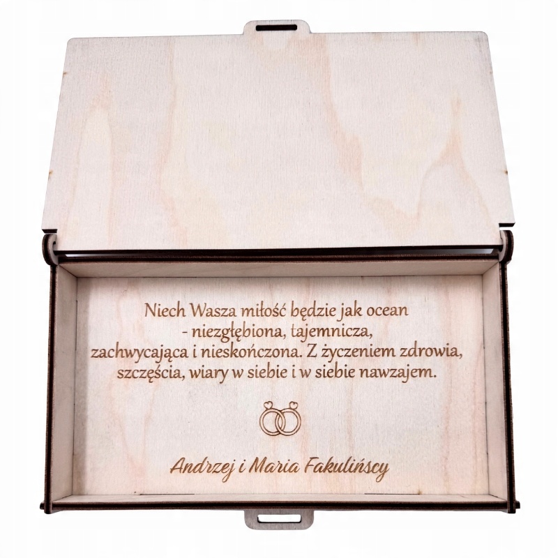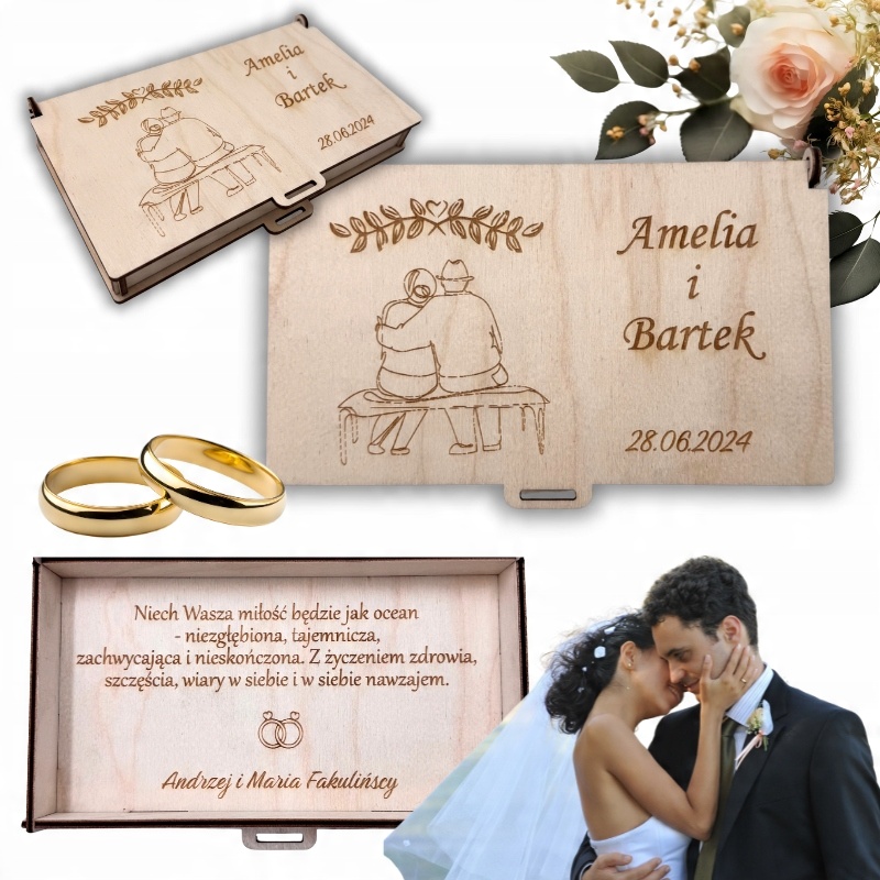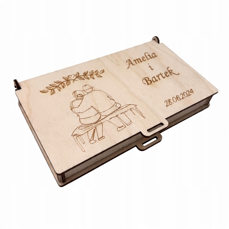 Drewniane pudełko Koperta na pieniądze obrączki ŚLUB WESELE z życzeniami